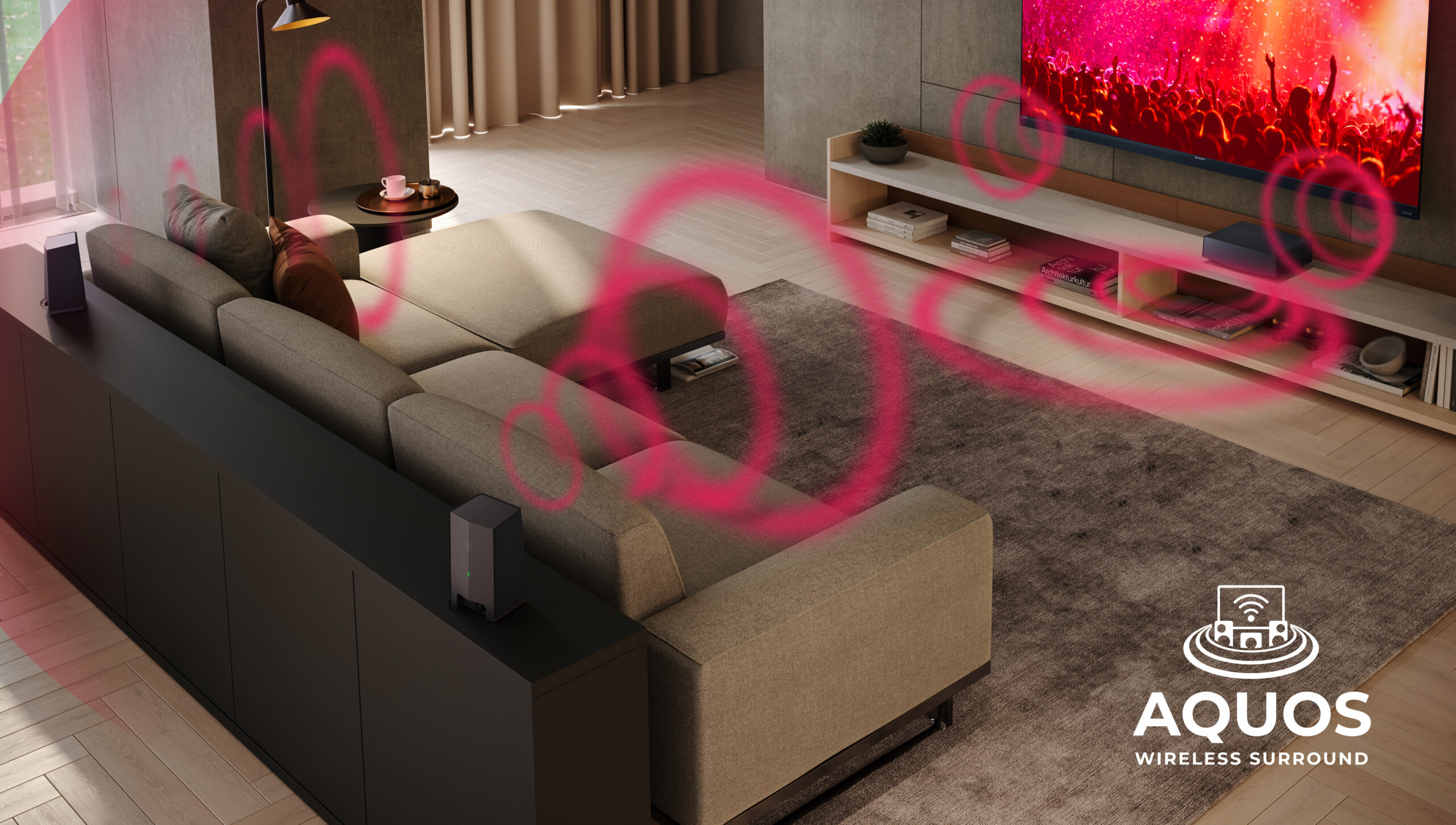 The full package. Expand your compatible Sharp AWS TV with the AQUOS Wireless Surround system for full surround 3D sound and cinema-style bass performance.