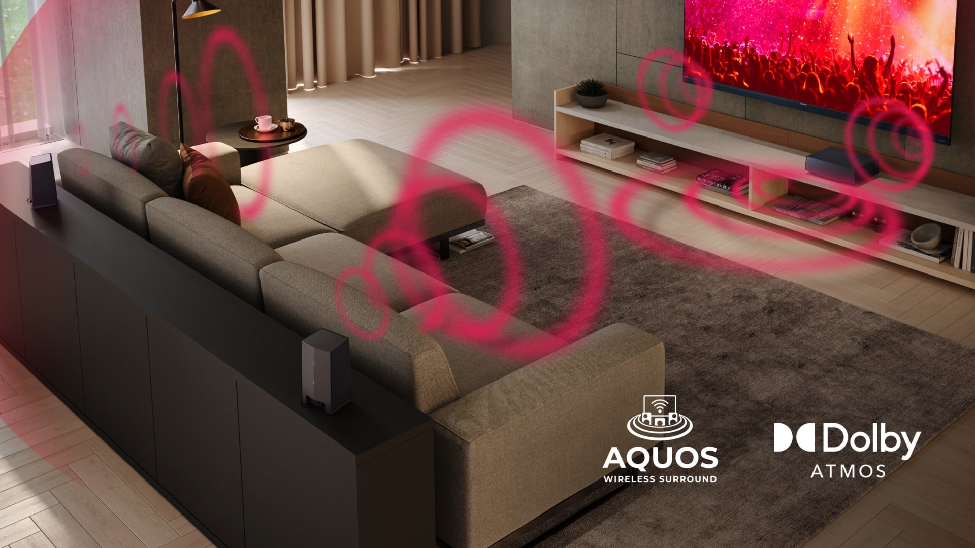 The full package. Expand your compatible Sharp AWS TV with the AQUOS Wireless Surround system for full surround 3D sound and cinema-style bass performance.